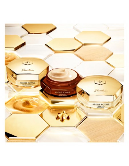 Bogata dnevna krema Guerlain Abeille Royale združuje tehnologijo Blackbee Repair in derivat vitamina C za učvrstitev kože, zglajevanje gub in gubic ter vidno izboljšanje sijaja polti. Balzamska tekstura kreme izgine na koži in jo intenzivno nahrani, ne da bi pustila masten film.