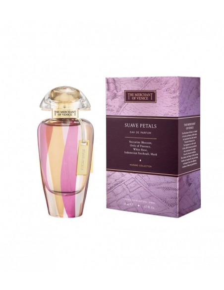 Dišava Suave Petals je obarvana v žametno rožnat vzorec, ki spominja na nežno ženstvenost cvetov vrtnice in breskve, ki ju vsebujeta. Okrogla ženstvena oblika je dodatno okrašena z zlato kitko okoli vratu in elegantno belo polprosojno kapo, ki spominja na trgovsko dejavnost La Serenissime skozi vgravirano vrtnico vetrov.  Nežna steklenička parfuma Suave Petals spominja na starodavno muransko steklo. Zahvaljujoč rožnati barvi spominja na ženstvenost in nežnost cvetov breskve, ki jih vsebuje dišava.