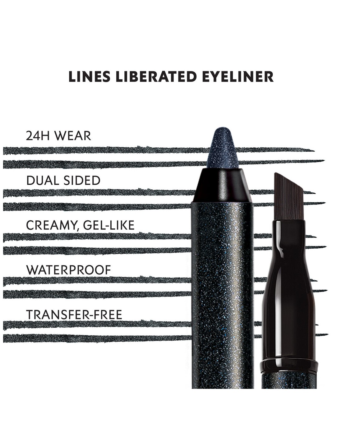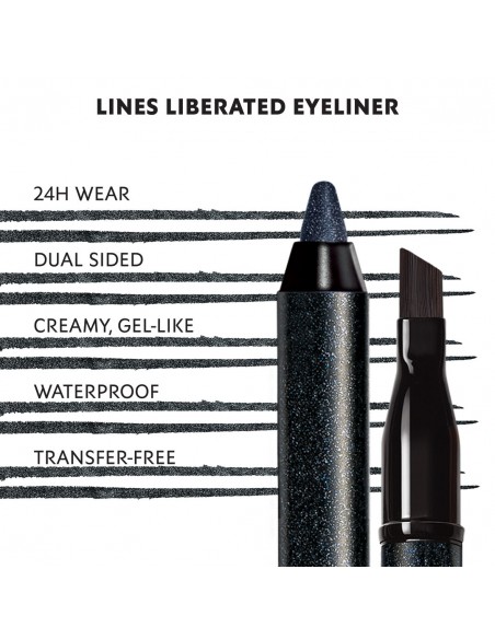 Vodoodporno črtalo za oči Lines Liberated je visoko pigmentirano, udobno in enostavno za zabrisovanje. Vsebuje nov aplikator 3 v 1 pod poševnim kotom za lažje oblikovanje. Močna sestavina olja kaktusove fige zagotavlja izjemno drsečo teksturo.
